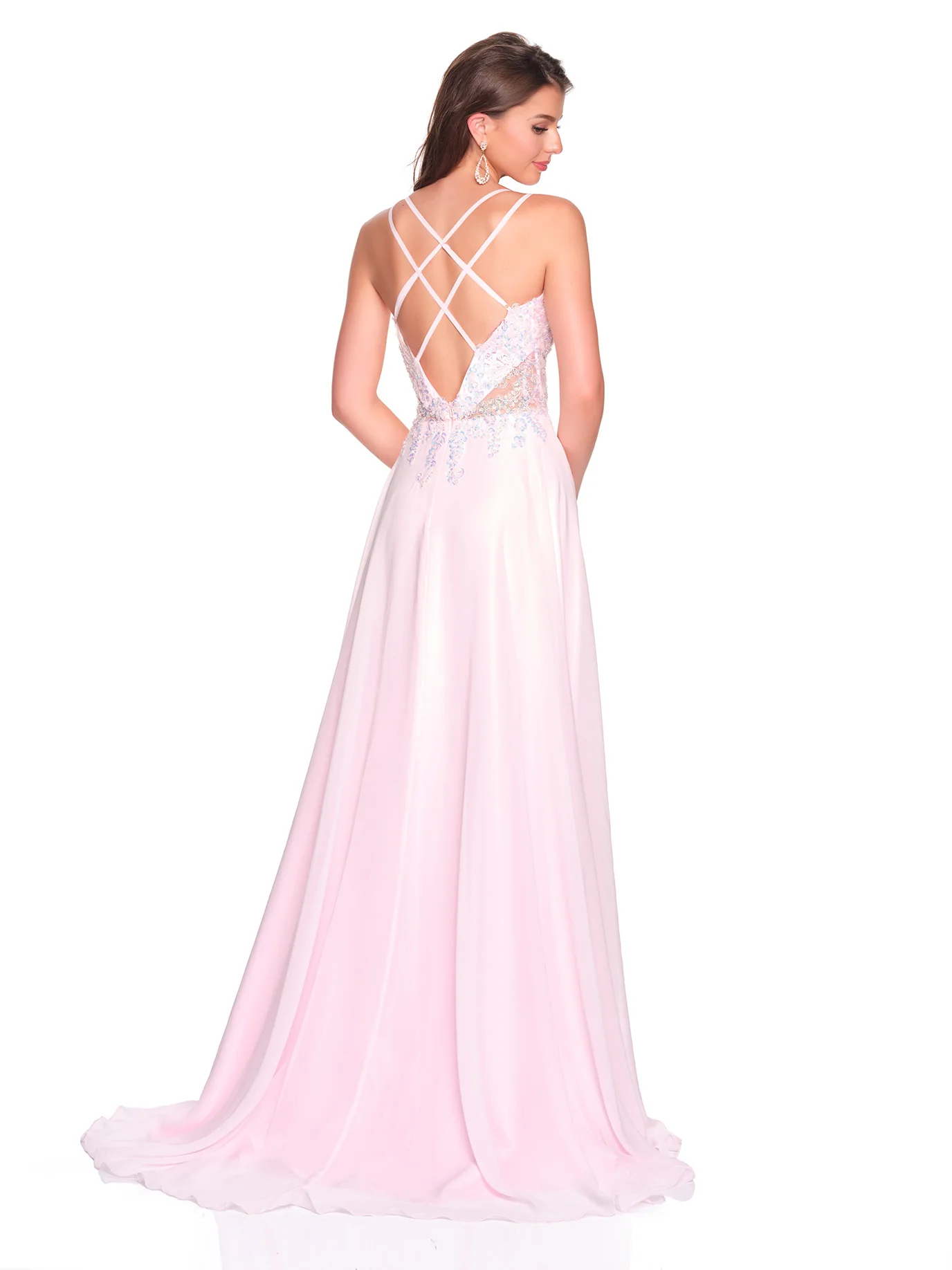Prom Dresses | This light pink prom dress is pure romance with a modern edge. Featuring a beautifully beaded corset-style bodice with sheer detailing, it gives a flattering, sculpted fit while still feeling light and elegant. The double spaghetti straps lead into a stunning crisscross open back that adds a show-stopping detail from every angle. The flowing chiffon skirt and thigh-high slit create effortless movement and just the right amount of drama. Perfect for girls searching for pink prom dresses in Ontario, this gown is ideal for prom, grad, or any formal night where you want to feel feminine, confident, and unforgettable.