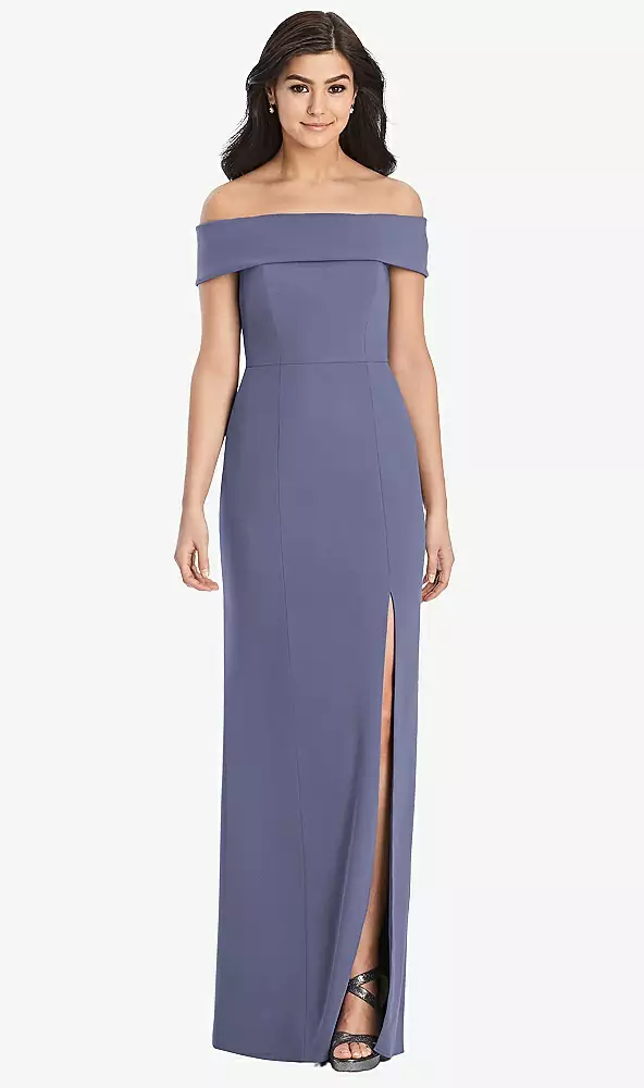 Mothers | Balance a flattering silhouette with the cuff details on the neckline of this off the shoulder crepe dress. The full-length trumpet skirt flows from a natural waist and features a slit at the side front for ultimate versatility.