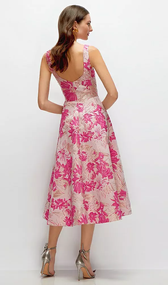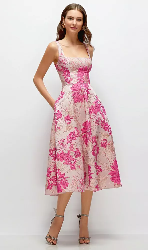 Mothers | This Hibiscus Pink Floral Jacquard midi dress radiates pure glamour with its vibrant, show-stopping style, perfect for bringing a little extra sparkle to any celebration. The luxe woven fabric shimmers with metallic accents, while the textured bright pink blooms pop against a lustrous pale pink backdrop, creating a look that's both bold and sophisticated. The square neckline and sleeveless cut feel effortlessly chic, balancing the classic with a bit of edge. With its full circle skirt that's ready for every twirl and hidden pockets for those day-of essentials, this multi-tone pink floral midi dress is as practical as it is striking—ideal for an unforgettable day.
