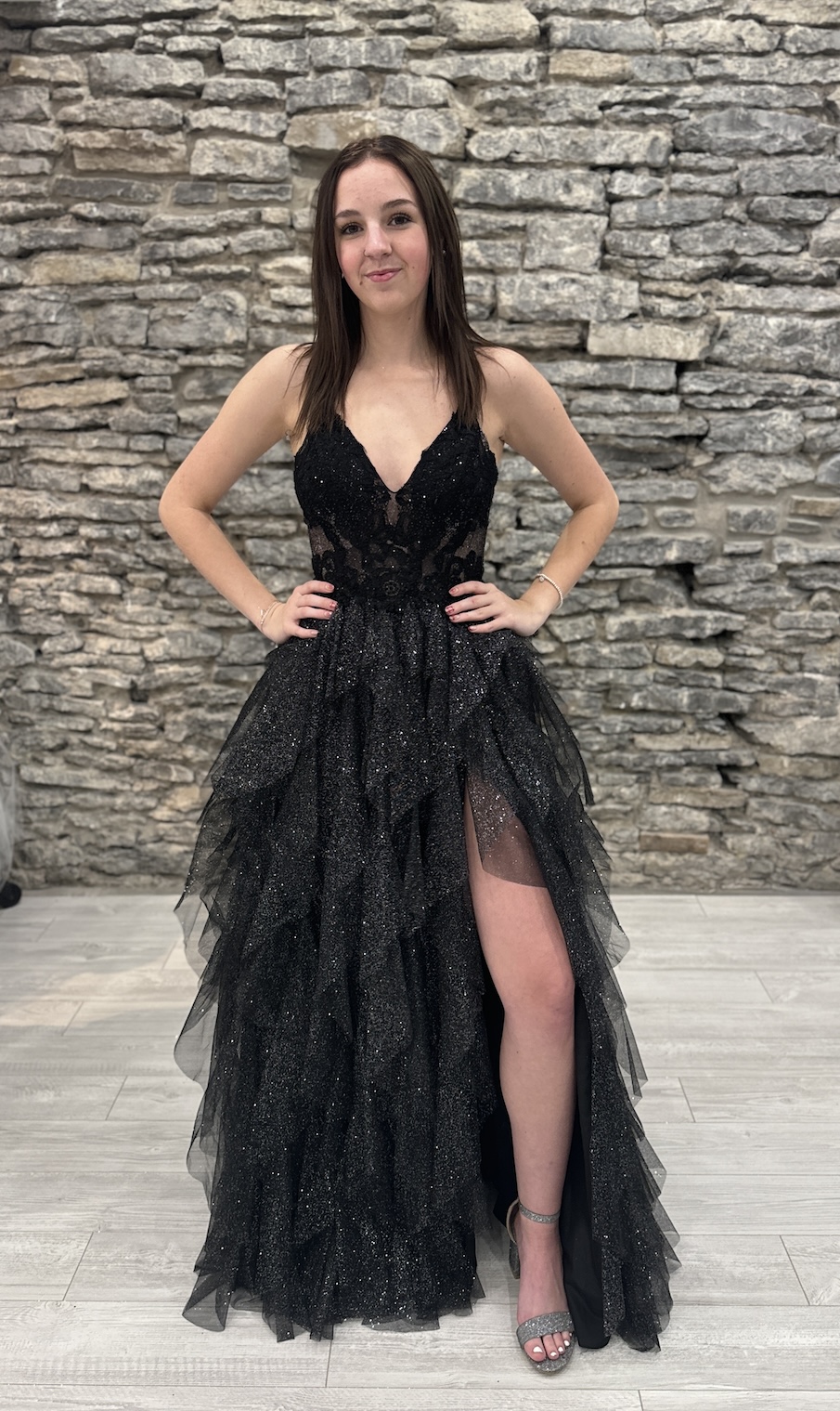 Prom Dresses | This prom dress is pure magic! With its sparkly layered tulle skirt, it’s ready to make you feel like the star of the night. The fitted bodice has a flirty V-neckline and delicate spaghetti straps, flowing into a cascade of ruffles and shimmer. The thigh-high slit adds a bold touch, perfect for showing off some leg while you dance. With its open back and gorgeous deep colour, this dress is all about making an unforgettable impression!