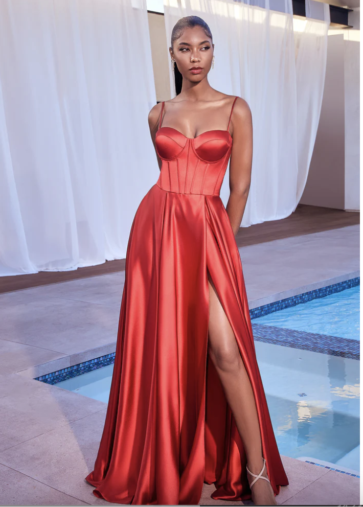 Prom Dresses | Make a statement in this timeless satin A-line bustier dress. With a classic and elegant feel, this exquisite dress will never go out of style. Its A-line silhouette cascades in a beautiful flow, and the satin fabrication is divinely soft to the touch. The thin straps offer a delicate femininity, and the boned corset bodice provides a stunning and sophisticated look. Add a hint of allure with the sophisticated leg slit. Perfect for a romantic dinner date or a special night out, this divine dress will surely turn heads. Experience exquisite style with this classic and elegant satin A-line bustier dress.