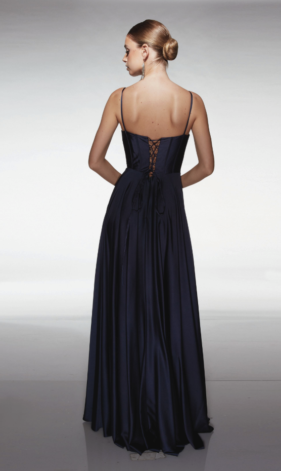 A curve-loving midnight navy prom dress with an adjustable lace-up back, and leg slit.