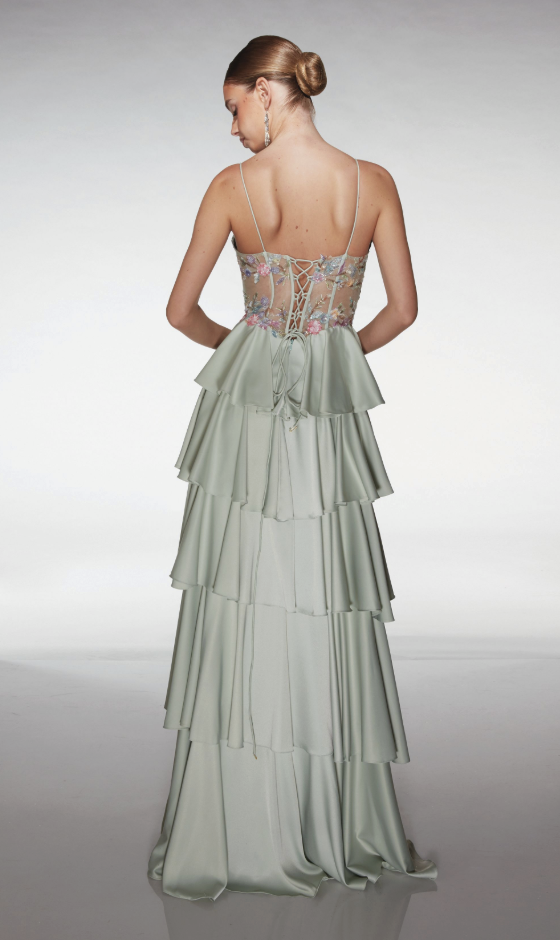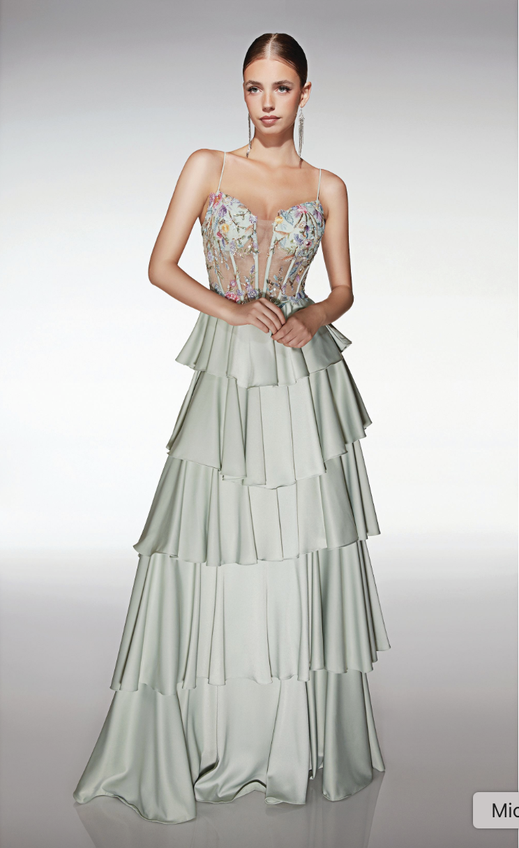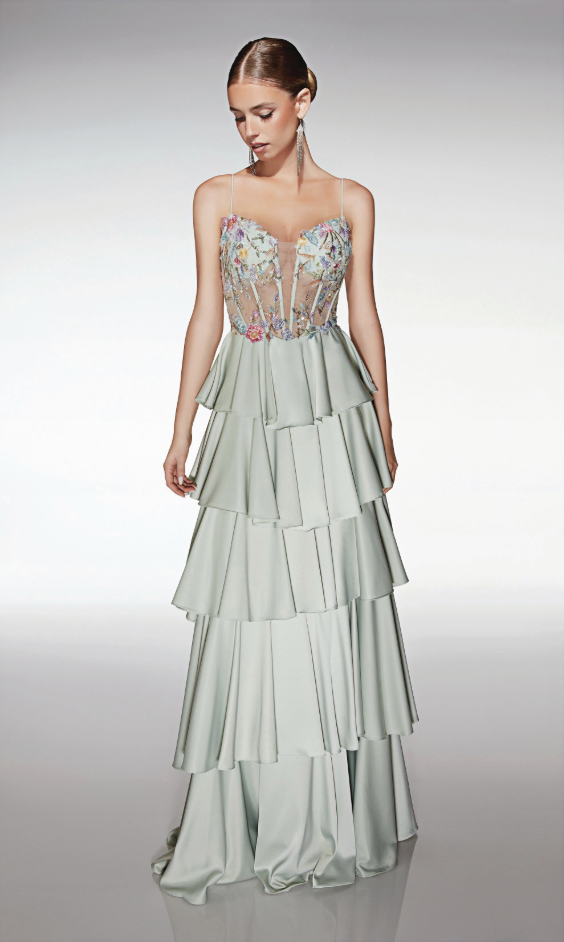 A pastel tiered prom gown with a floral beaded corset, for the girl who wants fairytale energy.