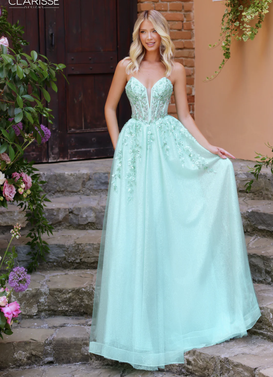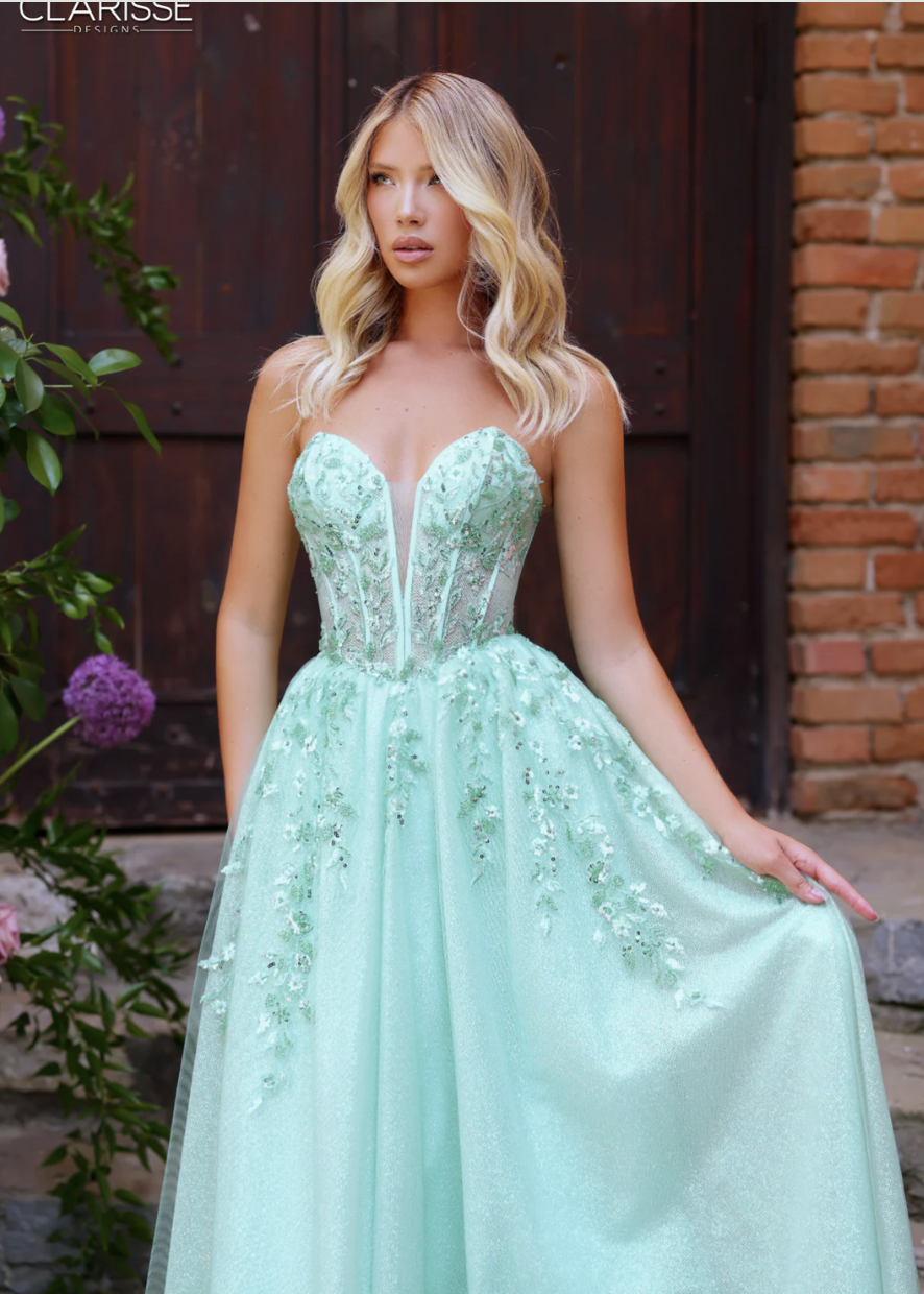 Prom Dresses | This breathtaking light green prom dress is made for the girl who dreams of a true wow moment. Designed with a structured corset bodice and a plunging illusion neckline, this gown offers both support and a flattering fit. Soft floral appliqués cascade into a full, flowy ballgown skirt crafted from shimmering tulle that catches the light with every step. Romantic, elegant, and undeniably magical, this dress is perfect for prom shoppers looking for a princess-inspired silhouette. Available now at Runway Bridal in Belleville, serving prom girls across Eastern Ontario. Book your prom appointment early to try on this unforgettable style.