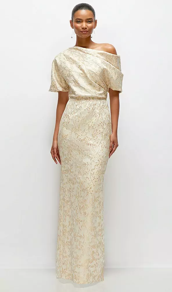 Mothers | This Champagne Filigree Brocade maxi dress, perfect for mother of the bride or mother of the groom, is pure luxe. Blending classic charm with modern glam. The luxe champagne fabric is woven with delicate textured blooms and shimmers with pale gold metallic accents on the leaves. The asymmetrical peekaboo neckline falls in that perfectly undone way, while its draped bodice and sleek column skirt bring a goddess vibe. A sleek back slit adds a spark of movement, making every step feel effortlessly graceful. This off-shoulder floral maxi dress is a nod to vintage glamour, crafted for occasions where every detail matters.