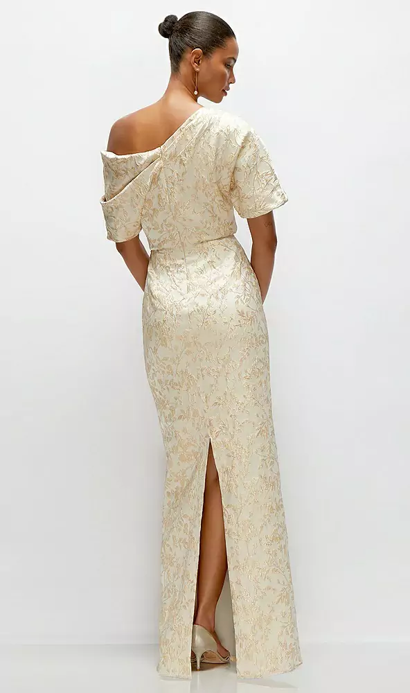 Asymmetrical Off-the-Shoulder Champagne Filigree Brocade Maxi Dress in Champagne Filigree