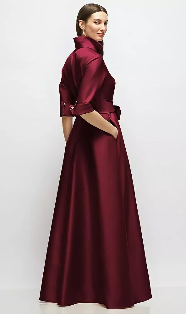 Mothers | This long Satin Twill shirt dress gown effortlessly fuses polished style with a hint of glam. A sharp point collar and chic three-quarter sleeves bring structured sophistication, while dazzling jewelled buttons sparkle subtly at the faux French cuffs and neckline. With a sleek, concealed front button placket, the silhouette is tailored at the bust and waist, flowing softly into a relaxed hip and full skirt—complete with pockets. A matching sash ties at the waist, creating an enviable silhouette. It's a timeless satin maxi dress with understated polish and an undeniably luxe feel to make you feel beautiful as mother of the bride or groom.