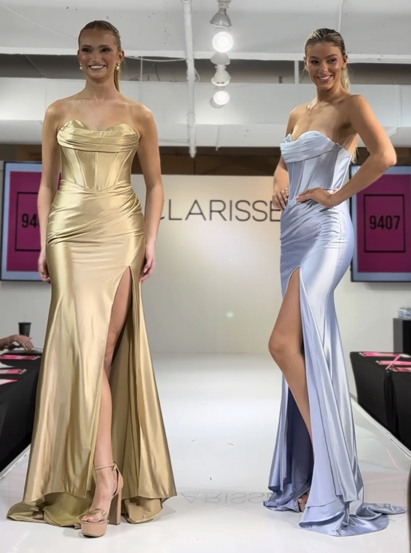 Prom Dresses | This light blue prom dress delivers timeless elegance with a modern twist. Designed in silky satin, the gown features a strapless corset bodice that offers structure and support while enhancing your natural shape. The fitted skirt skims the body and opens into a subtle thigh-high slit, adding movement and drama without overpowering the look. A stunning option for prom girls who want something sleek, flattering, and unforgettable. Available at Runway Prom in Belleville, serving prom shoppers across Eastern Ontario.