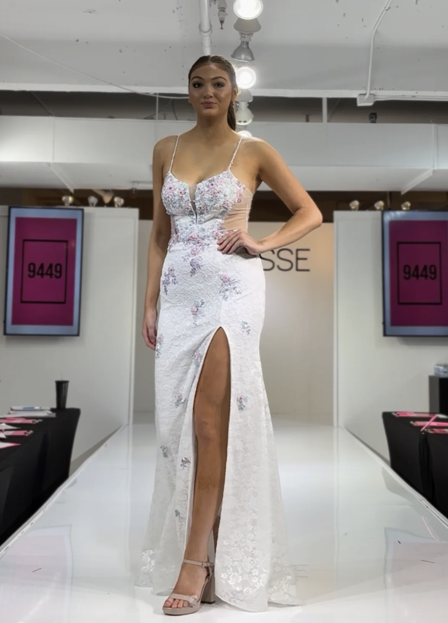 Prom Dresses | This elegant floral lace prom dress blends timeless romance with a sleek, contemporary fit. Featuring a softly structured bodice with delicate spaghetti straps and a subtle illusion side detail, this gown hugs through the waist and hips before flowing into a graceful skirt with a front leg slit for added movement and confidence. The allover lace with soft floral detailing creates a feminine, elevated look that’s perfect for prom night, formal events, or graduation celebrations.