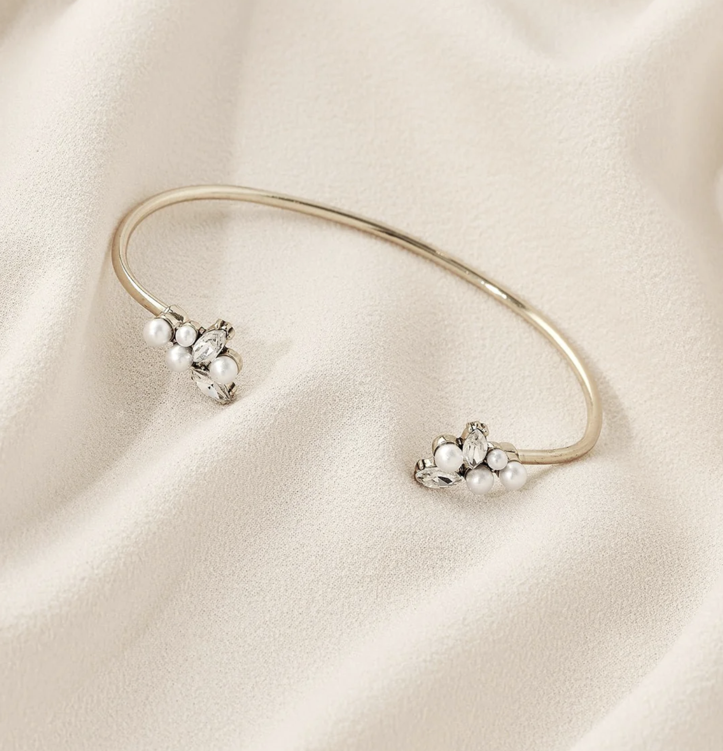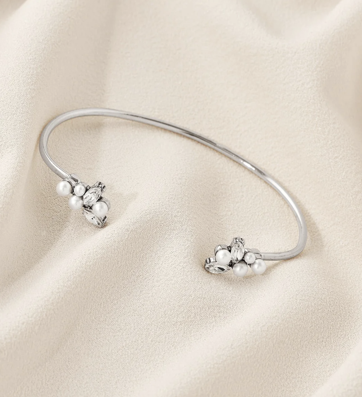 This delicate and dainty cuff bracelet is adorned with a crystal and pearl cluster.