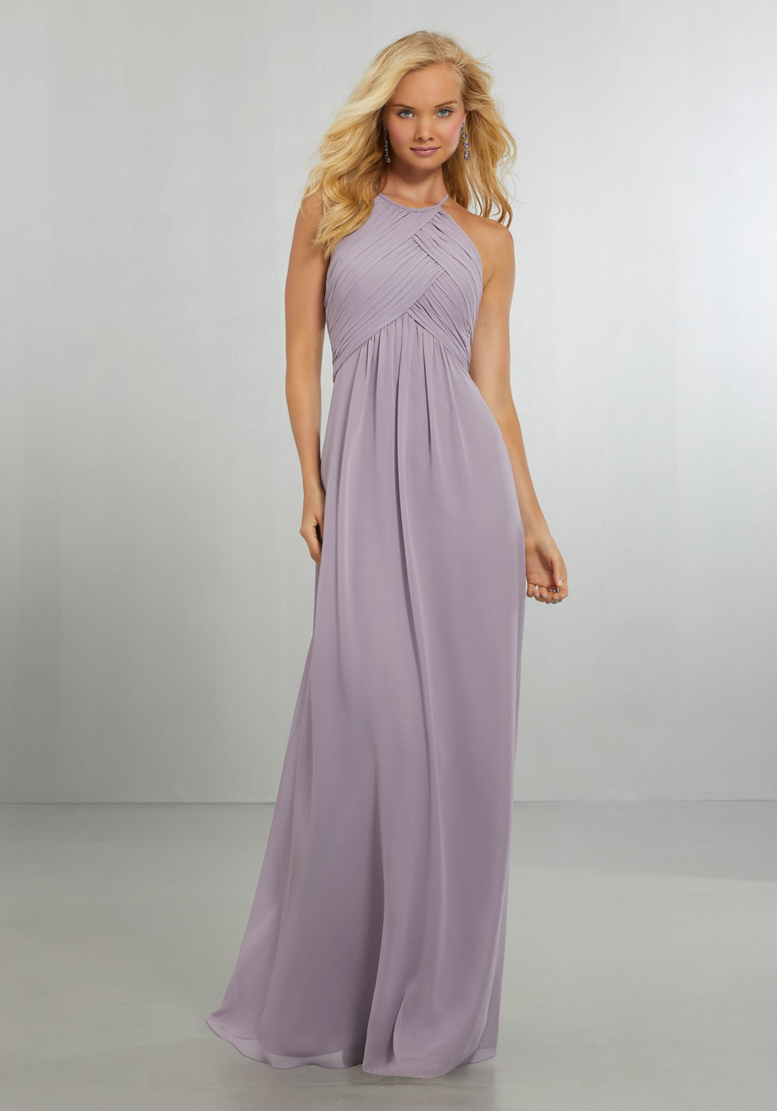 Bridesmaid Dresses | Draped Halter Chiffon Gown with High Neckline and Keyhole Back, Accented with a Crystal Button and Back Zipper. Available in all chiffon colours, and as a quick ship at no extra charge in 6-8 weeks, in select colours.
