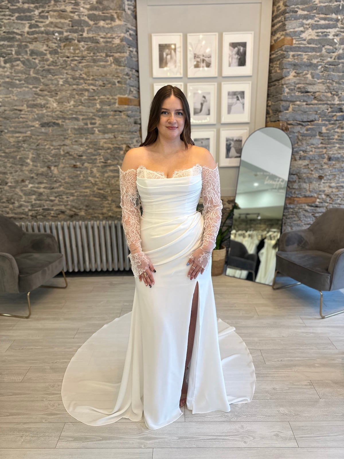 Wedding Dresses | Gemma is the definition of effortless elegance. This fitted wedding gown features soft, flattering draping across the bodice, paired with detachable delicate off-the-shoulder lace sleeves that add just the right touch of romance. The clean, structured skirt is available with or without a slit, giving you the freedom to choose a timeless look or a little extra leg moment. Finished with a sweeping train, Gemma blends simplicity, sophistication, and modern bridal style beautifully. (Sleeves Included)