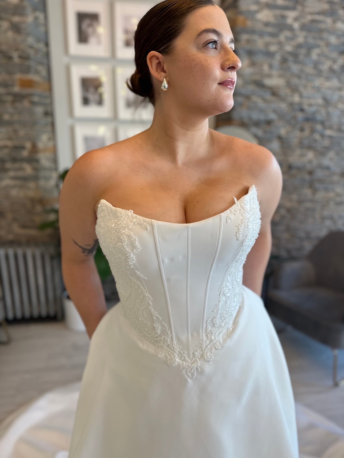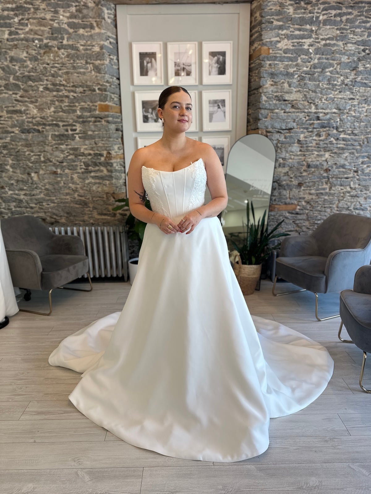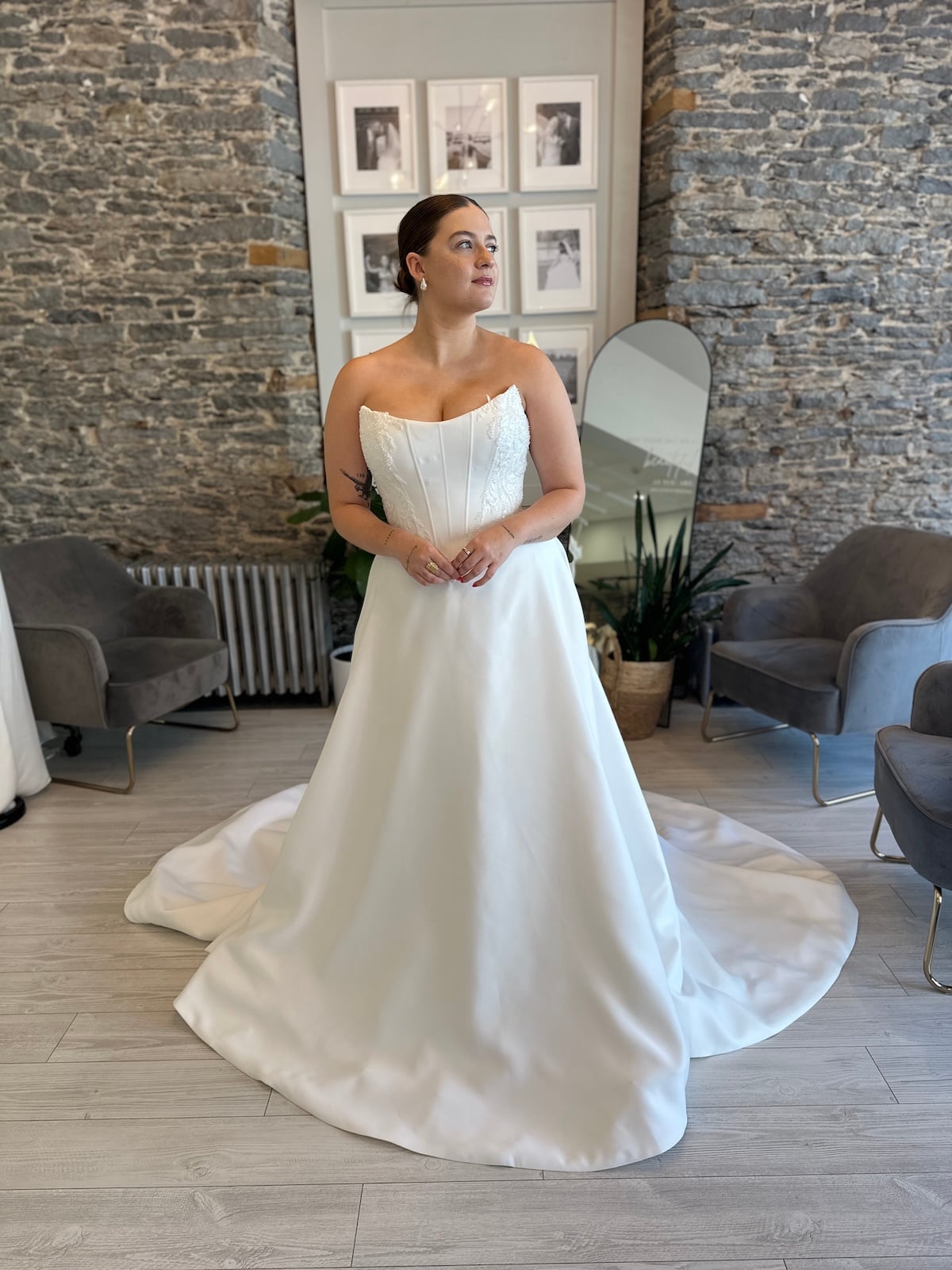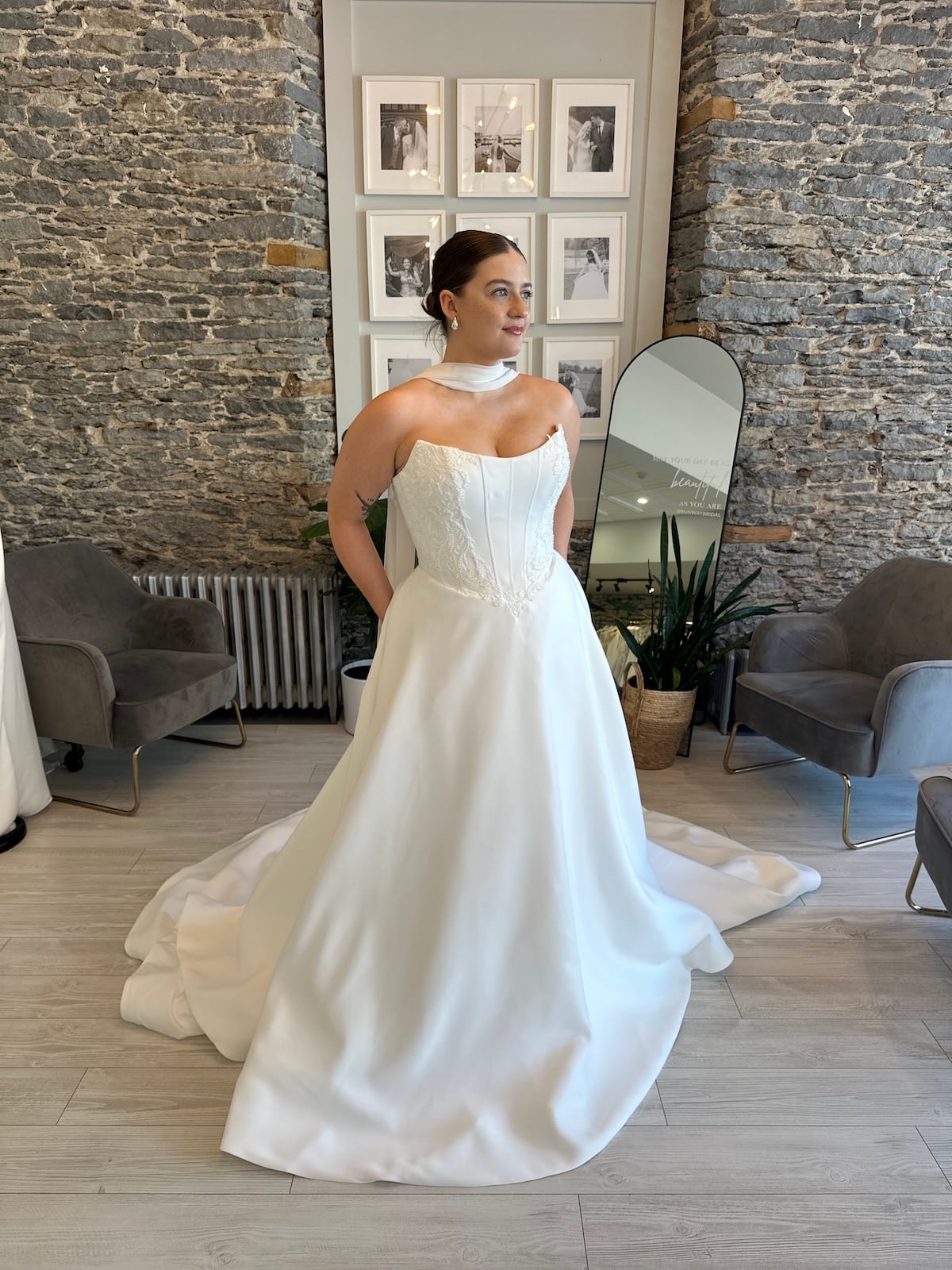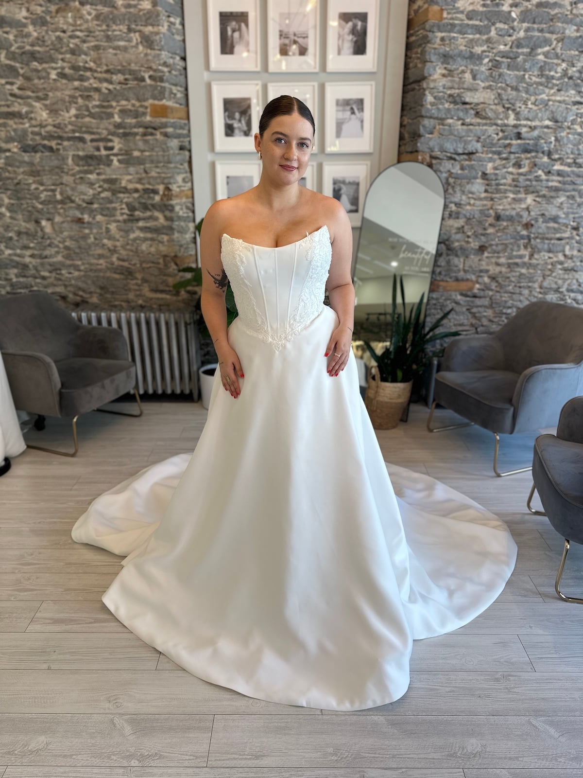 Wedding Dresses | Make an unforgettable entrance in Georgie, a regal satin ballgown designed for the bride who loves clean lines with a touch of whimsy. This structured wedding dress features a corset-inspired bodice with subtle boning and delicate embroidery that adds definition without overpowering the look. This dress offers soft romance while still feeling fashion-forward. With a full skirt and dramatic train, Georgie is perfect for brides seeking a timeless satin wedding gown with just the right amount of flair. Now available at Runway Bridal in Belleville, Ontario for off-the-rack and appointment-based shopping.