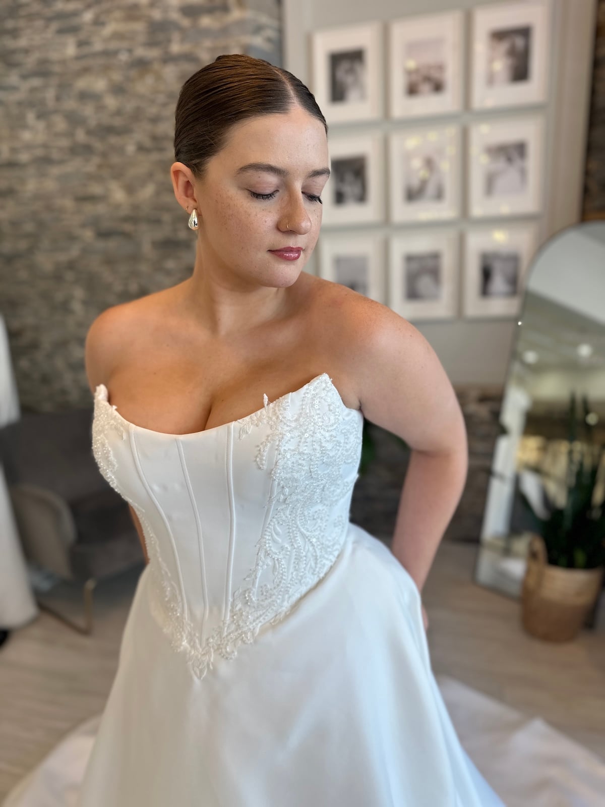 Classic satin ballgown with a structured corset-style bodice and beaded detailing.