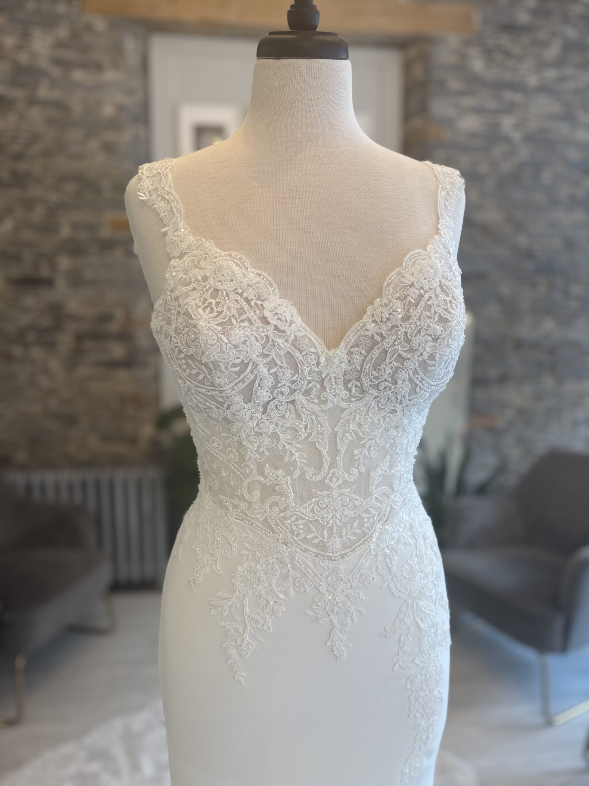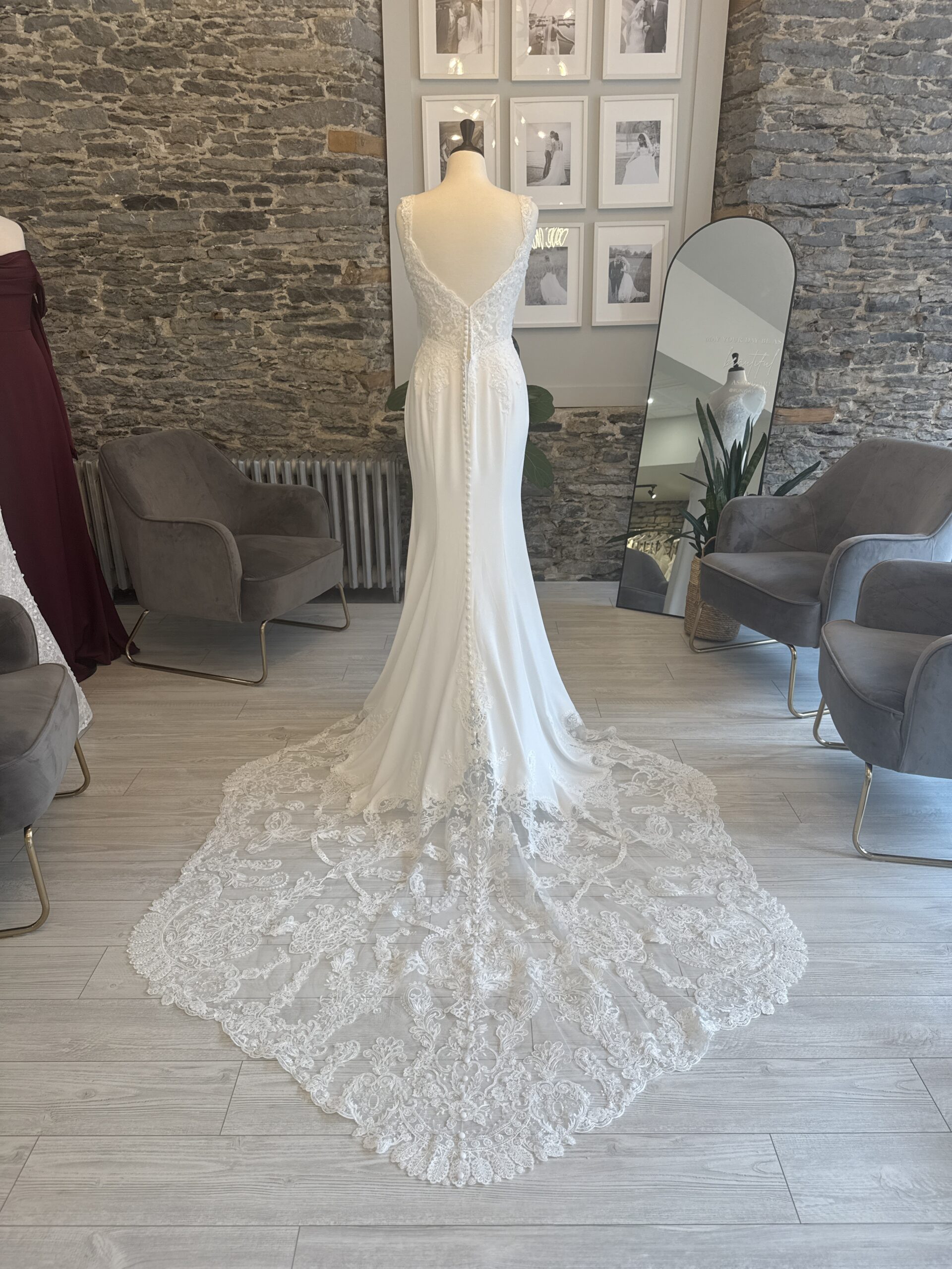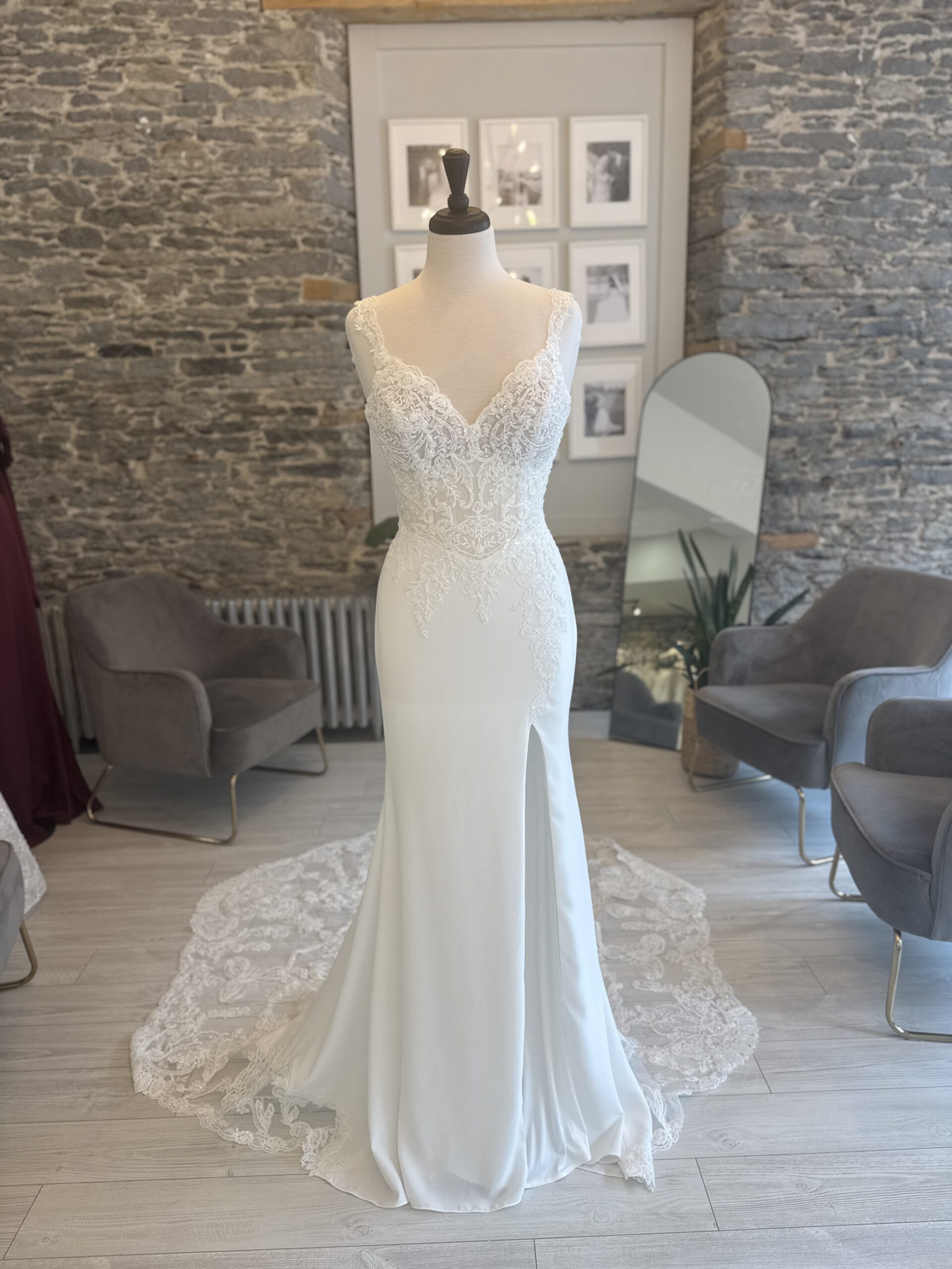 Wedding Dresses | Larsa is the perfect blend of modern sophistication and timeless romance. The fitted crepe skirt glides effortlessly over your curves, accented by a thigh-high slit for a touch of allure. A sheer lace bodice with a plunging neckline and delicate straps adds intricate detail, while the breathtaking lace train ensures a dramatic walk down the aisle. Designed for the confident bride who wants to turn heads, Larsa is elegance with an edge.