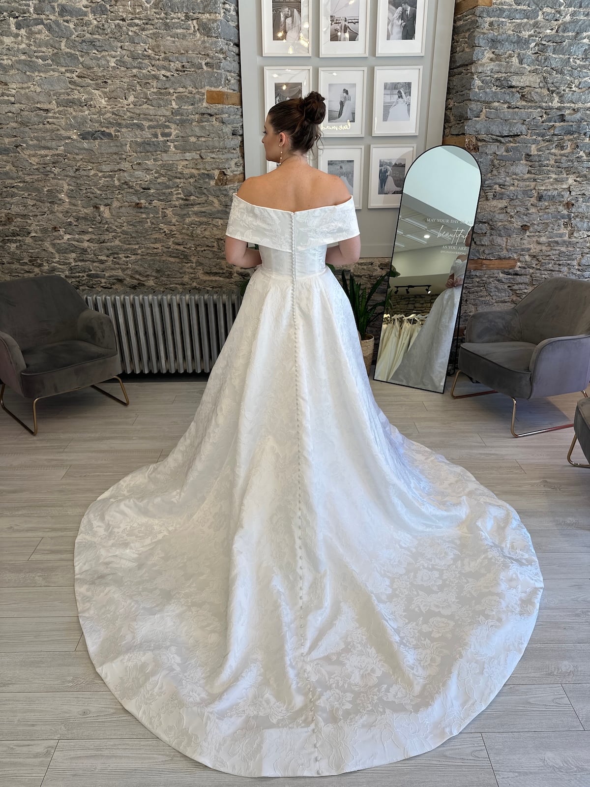A romantic off-the-shoulder brocade wedding gown with a full A-line skirt.
