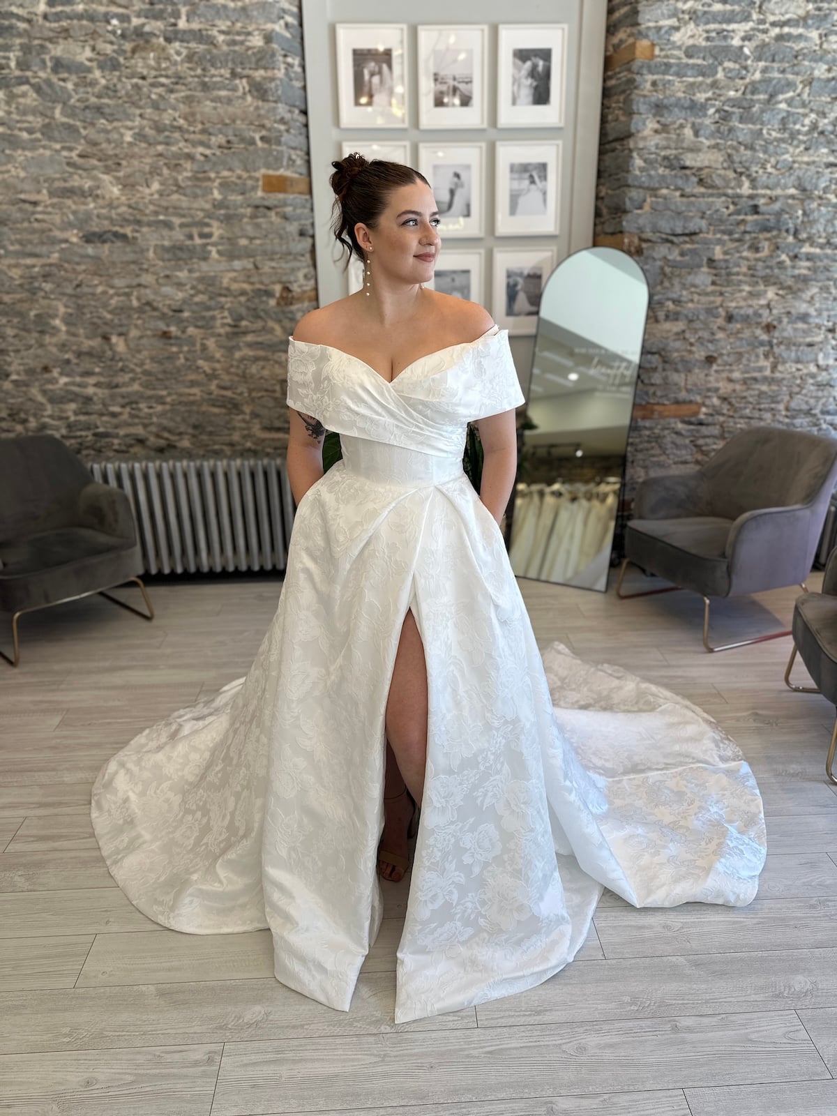 Wedding Dresses | Ledger is a show-stopping brocade wedding dress designed for the bride who loves classic romance with a fashion-forward twist. Featuring a softly draped off-the-shoulder neckline and a beautifully structured bodice, this gown highlights the waist while creating a flattering, feminine silhouette. The rich brocade fabric adds depth and texture, giving the dress a luxurious feel that stands out from traditional satin or lace gowns. Its full A-line skirt flows effortlessly into a dramatic train, making Ledger perfect for elegant ballroom weddings, estate celebrations, or any bride dreaming of a statement bridal look that feels both refined and unforgettable.