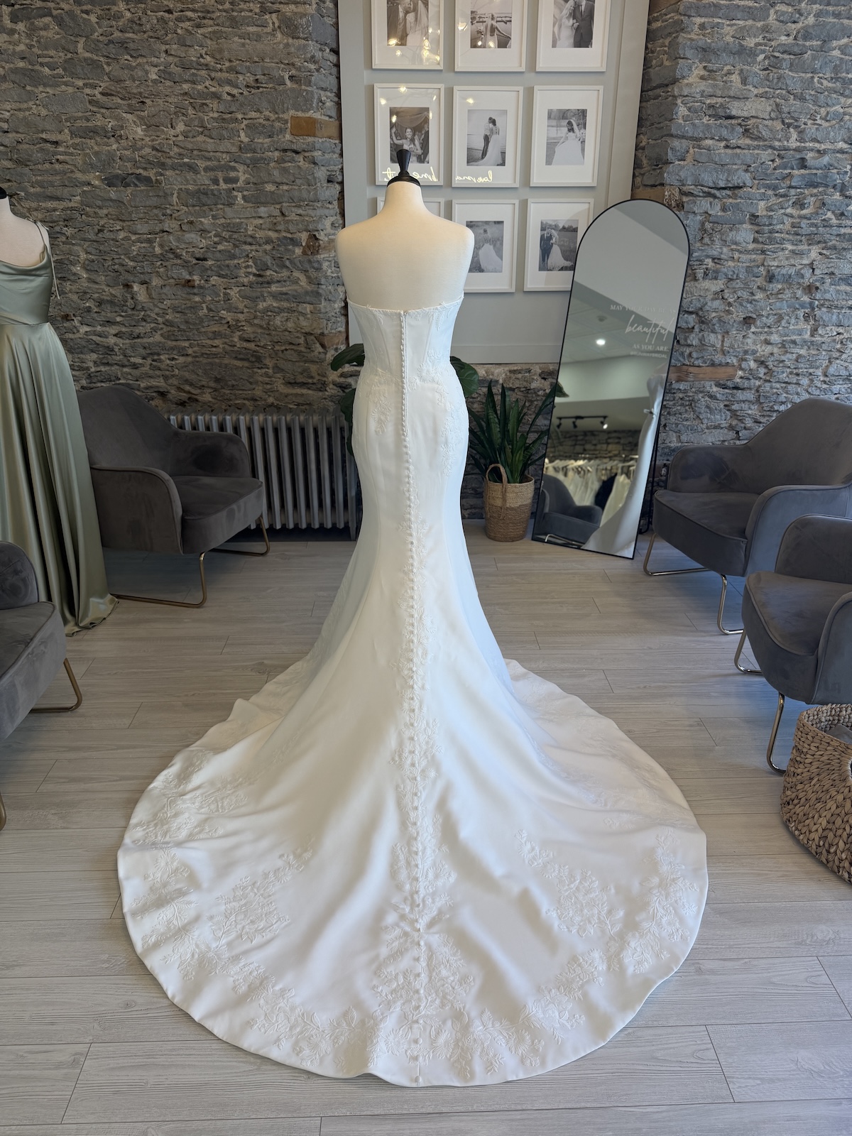 A stunning embroidered wedding gown that blends modern elegance with romantic, hand-stitched floral.