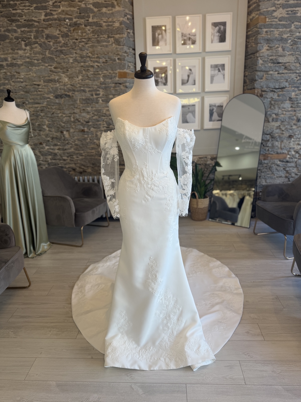 Wedding Dresses | This floral-embroidered wedding dress is made for the bride who wants to make a soft but unforgettable statement. Its sleek silhouette highlights your shape while delicate floral embroidery trails down the gown and hem, creating an artistic, garden-inspired finish. Off-the-shoulder lace sleeves add a touch of whimsy, making this dress perfect for brides craving a unique, romantic, and fashion-forward wedding-day look.