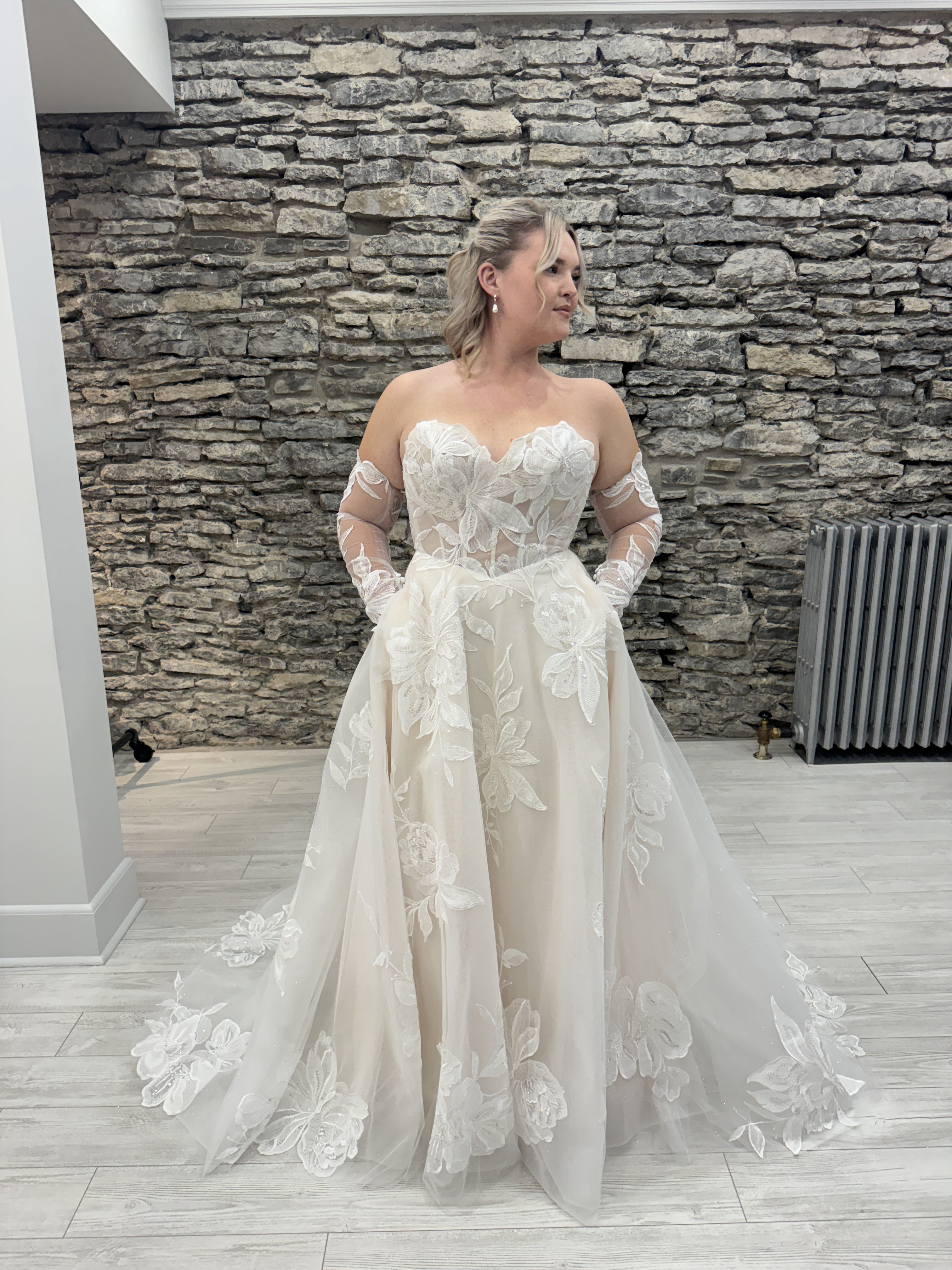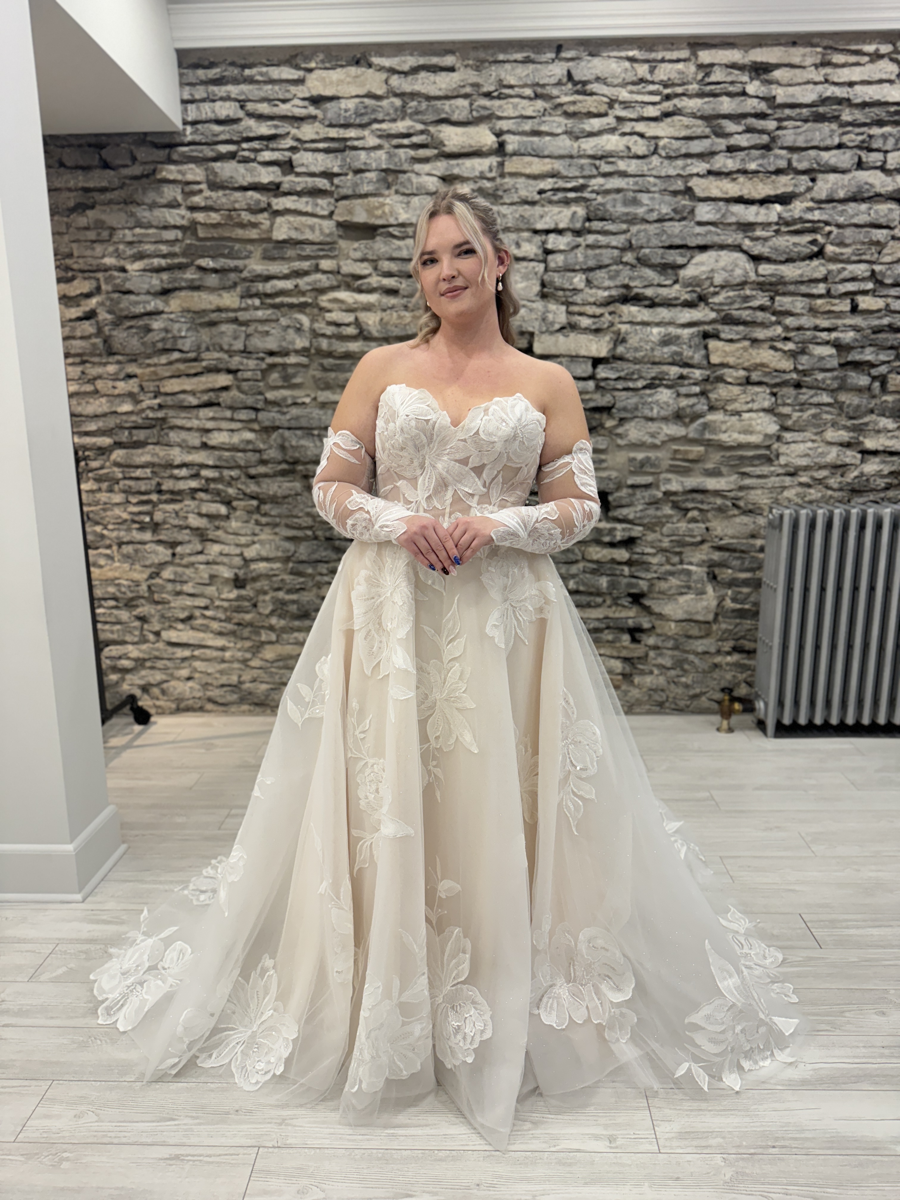A romantic brides dream, a floral aline with detachable lace sleeves.
