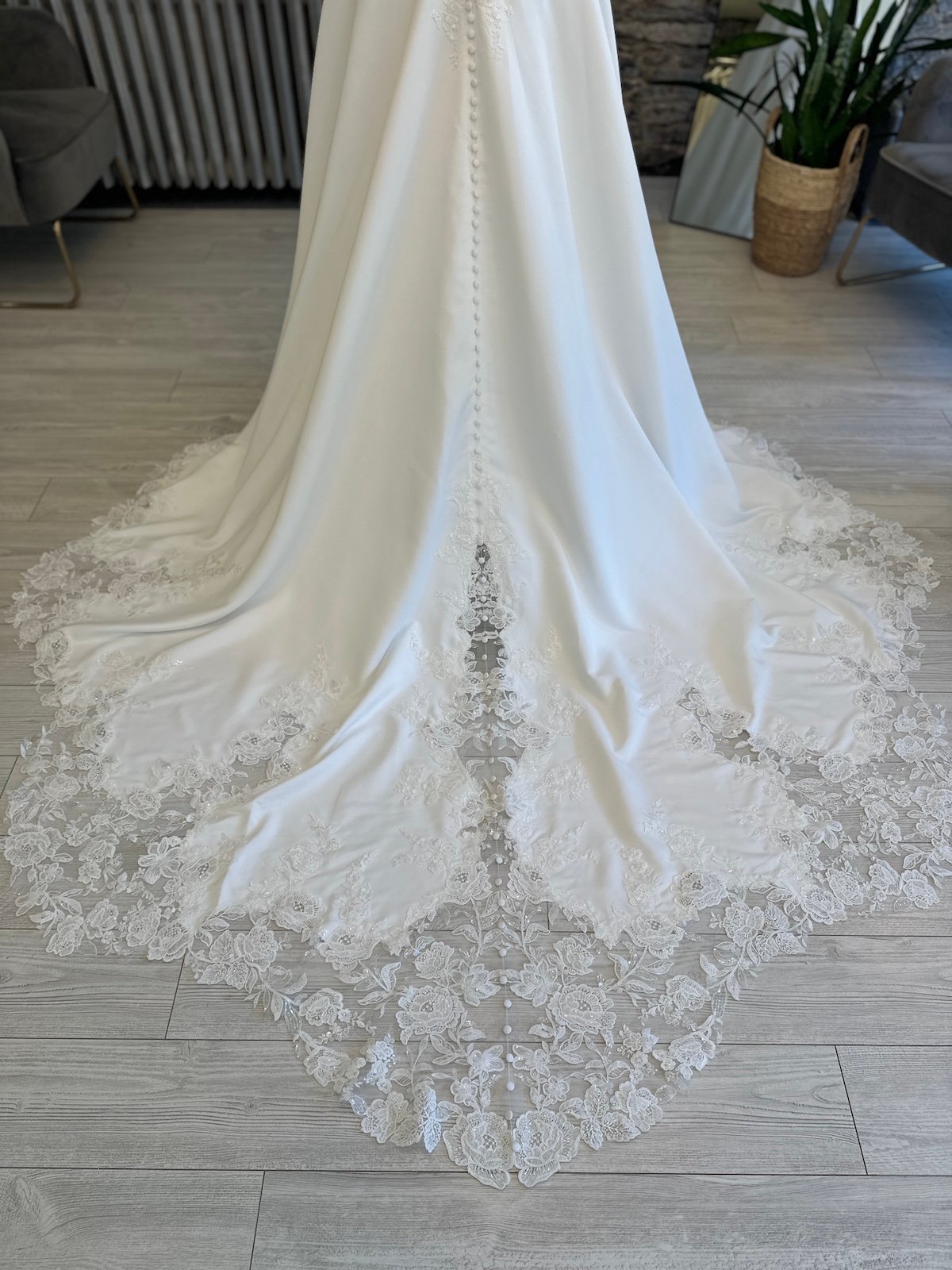 Wedding Dresses | Graceful and striking, the Lyall wedding dress blends timeless romance with contemporary flair. Soft off-the-shoulder draping frames the neckline, while subtle floral beadwork adds a touch of sparkle across the bodice and hips. Flowing into a full A-line skirt, Lyall finishes with an unforgettable cathedral-length train edged in intricate lace, perfect for brides dreaming of a dramatic, picture-perfect entrance.