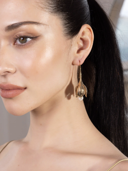 Accessories | The Mara Earrings capture effortless elegance with their sculpted gold floral petals and a soft, glowing pearl drop. Lightweight and striking, they’re the perfect statement for brides, bridesmaids, or anyone wanting a modern touch of vintage-inspired charm for weddings, parties, or everyday sparkle.
