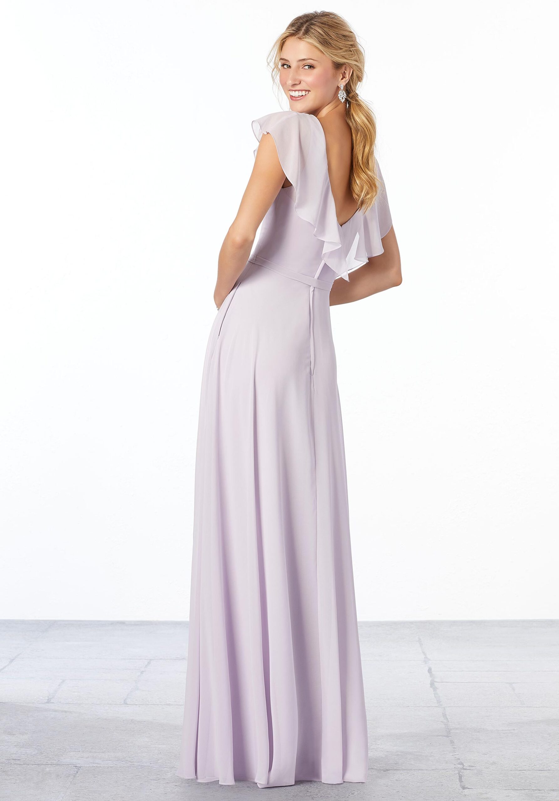 Bridesmaid Dresses | Elegant A-line chiffon bridesmaid dress with a surplice flutter sleeve, v-neck and v-back with matching tie sash. Available in all chiffon colours, and as a quick ship at no extra charge in 6-8 weeks, in select colours.