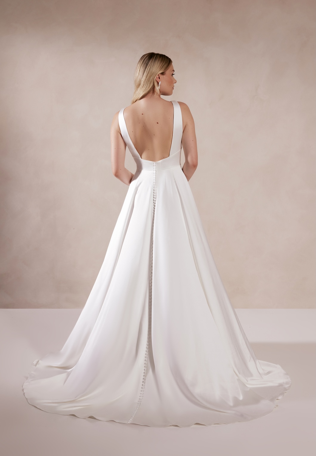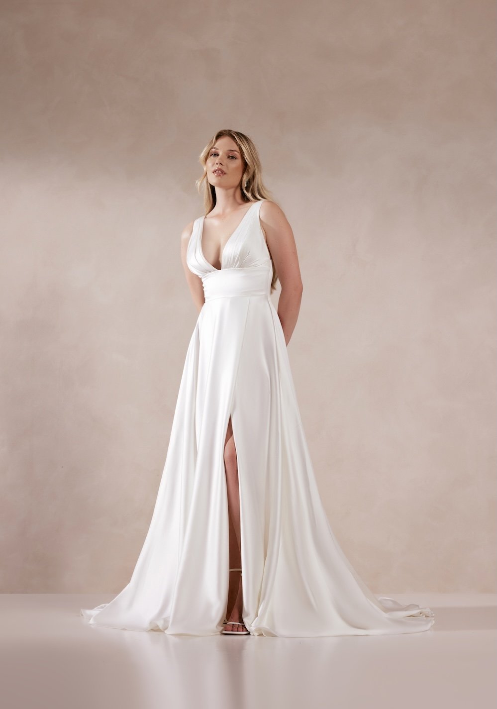 Wedding Dresses | Phaedra is available in size 18 and designed to celebrate your curves in the most stunning way. Crafted in luminous satin, this gown features a plunging neckline, a curve-loving A-line silhouette, and a daring thigh-high slit. The open back and button detail down the train add a timeless touch, making it the perfect blend of chic, flattering, and unforgettable.
