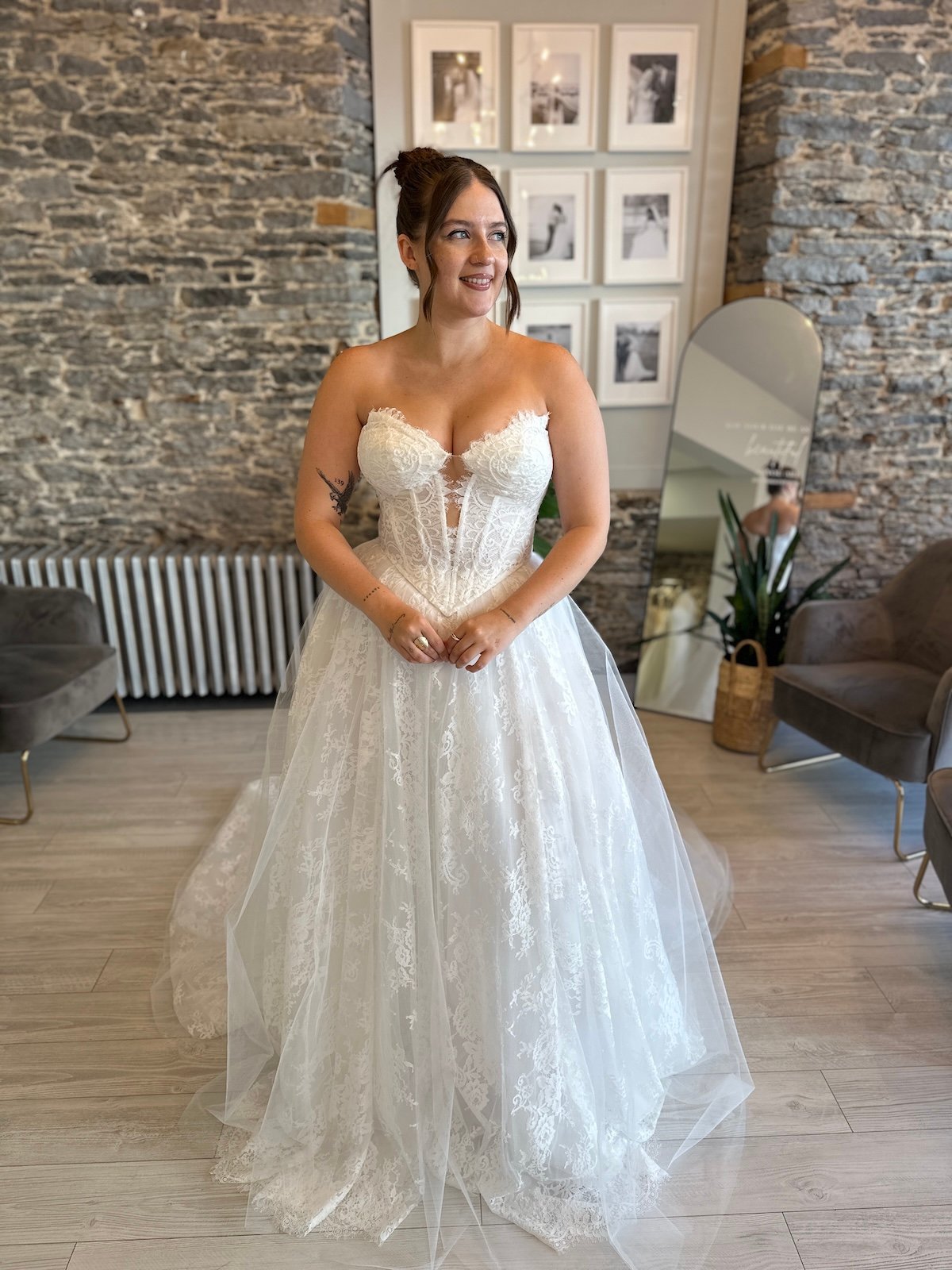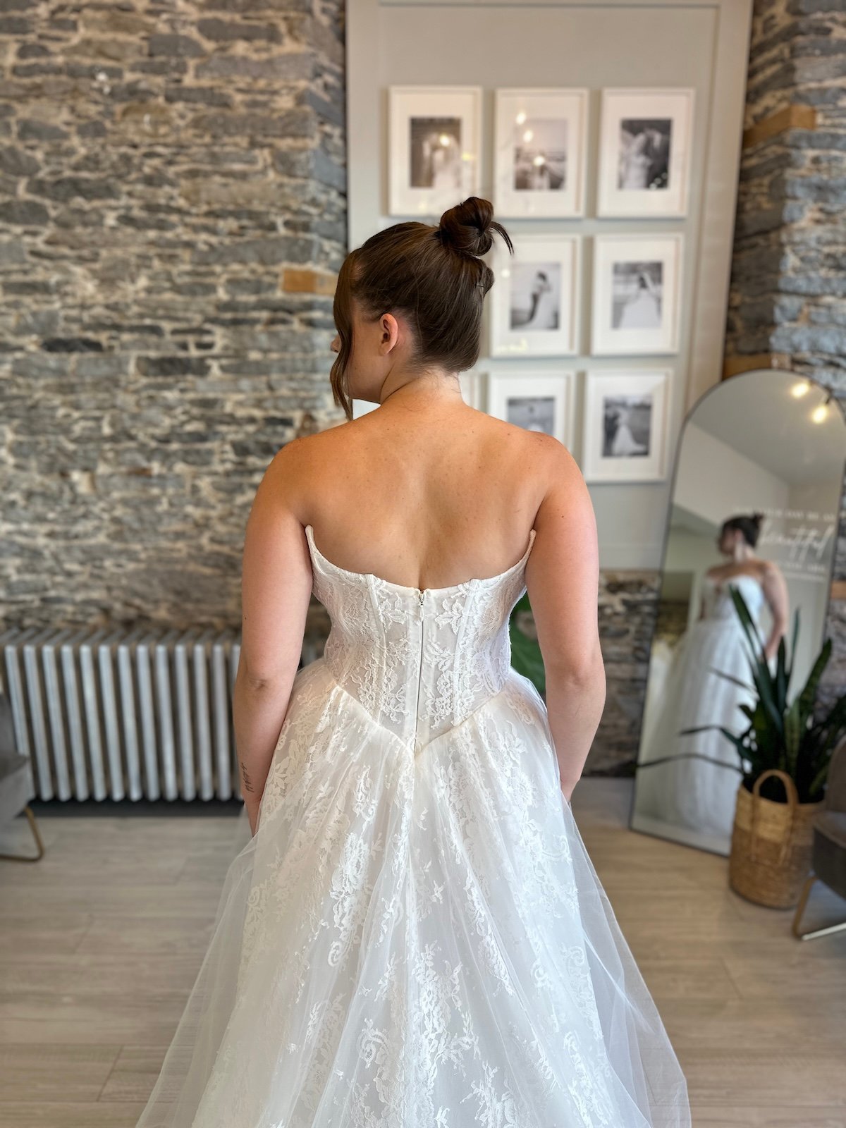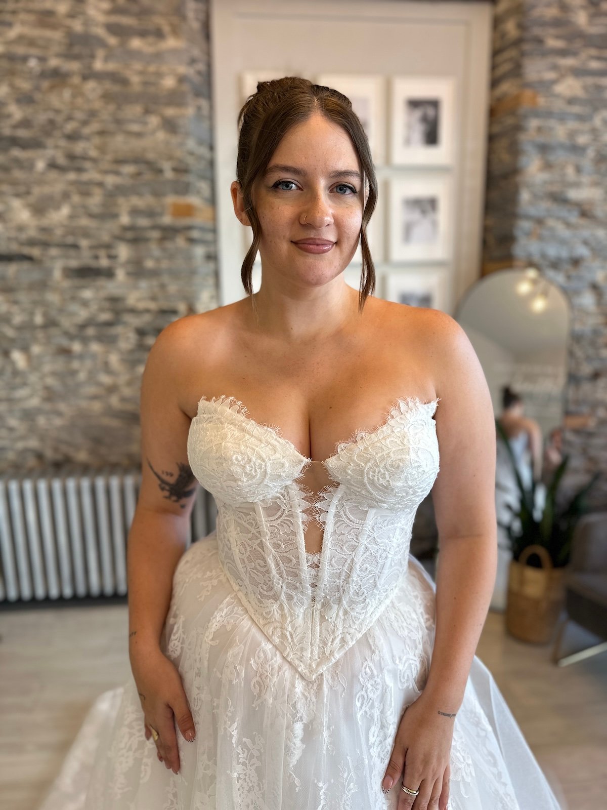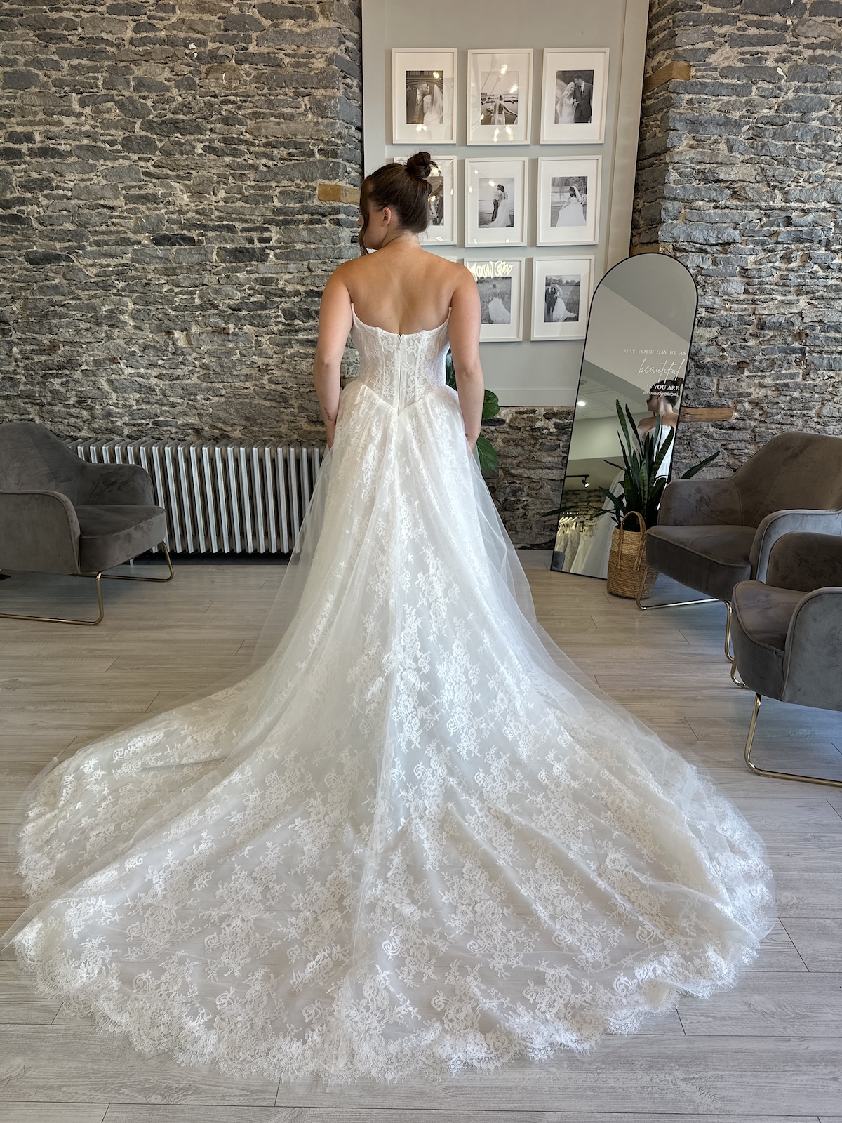 Soleil is a romantic lace ballgown featuring a sculpted corset bodice and a dreamy, flowing train.